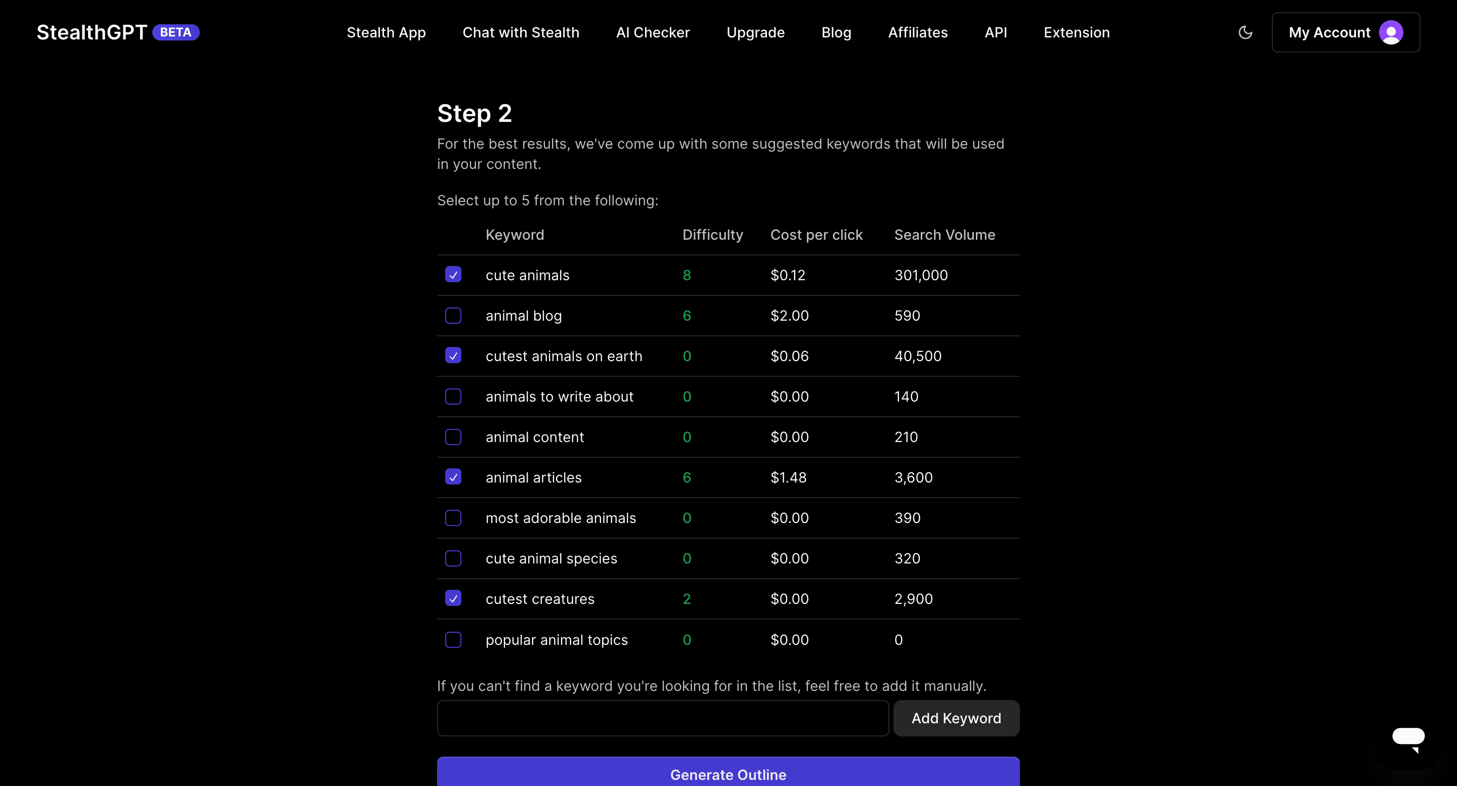 Once you have your blog idea, the SEO writer will conduct market research to give you a list of keywords you want to target. Then, it will generate an outline for you.