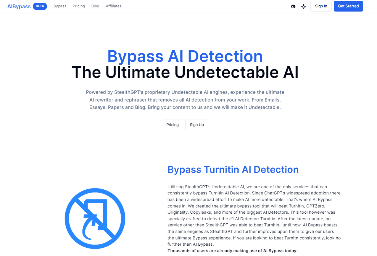 AIBypass is a service designed to help users modify their written content to evade detection by AI plagiarism tools such as Turnitin. It leverages StealthGPT's proprietary "Undetectable AI" engines to rephrase and rewrite text in a manner that appears human-written, aiming to bypass various AI detectors including GPTZero, Originality, and Copyleaks, with a special focus on Turnitin. AI Bypass markets itself as offering a unique solution that stands out from other undetectable AI tools by providing superior rephrasing capabilities.
