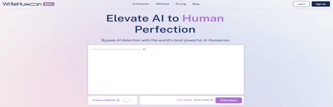 WriteHuman streamlines the humanization of AI-generated text into three simple steps: copy, paste, and click. Compatible with diverse AI content generators and detection systems like Turnitin and ZeroGPT, it efficiently removes AI detection, safeguarding online privacy and anonymity. Users can confidently submit content without raising red flags, thanks to WriteHuman's potent AI detection removal capabilities. By empowering users to take charge of their AI privacy, WriteHuman ensures undetectable content creation while preserving anonymity. It heralds a new era of seamless content generation, where privacy and authenticity converge to offer a secure and genuine writing experience. With WriteHuman, users can enjoy the freedom to express themselves without leaving a digital footprint, ensuring peace of mind in an increasingly AI-driven world.