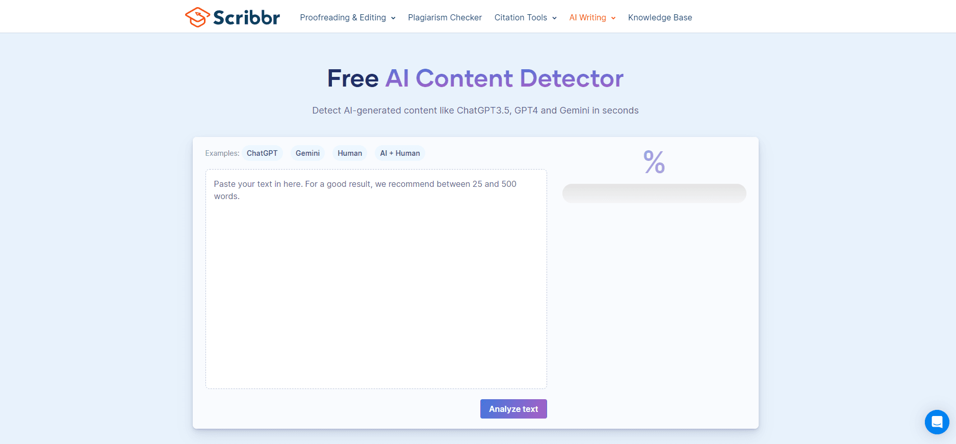 Scribbr AI Content Detector is a tool designed to identify AI-generated content, such as text produced by ChatGPT 3.5, GPT4, and Gemini. The tool requires no sign-up and is free of charge; once you click the button, it will instantly check your text for you automatically.