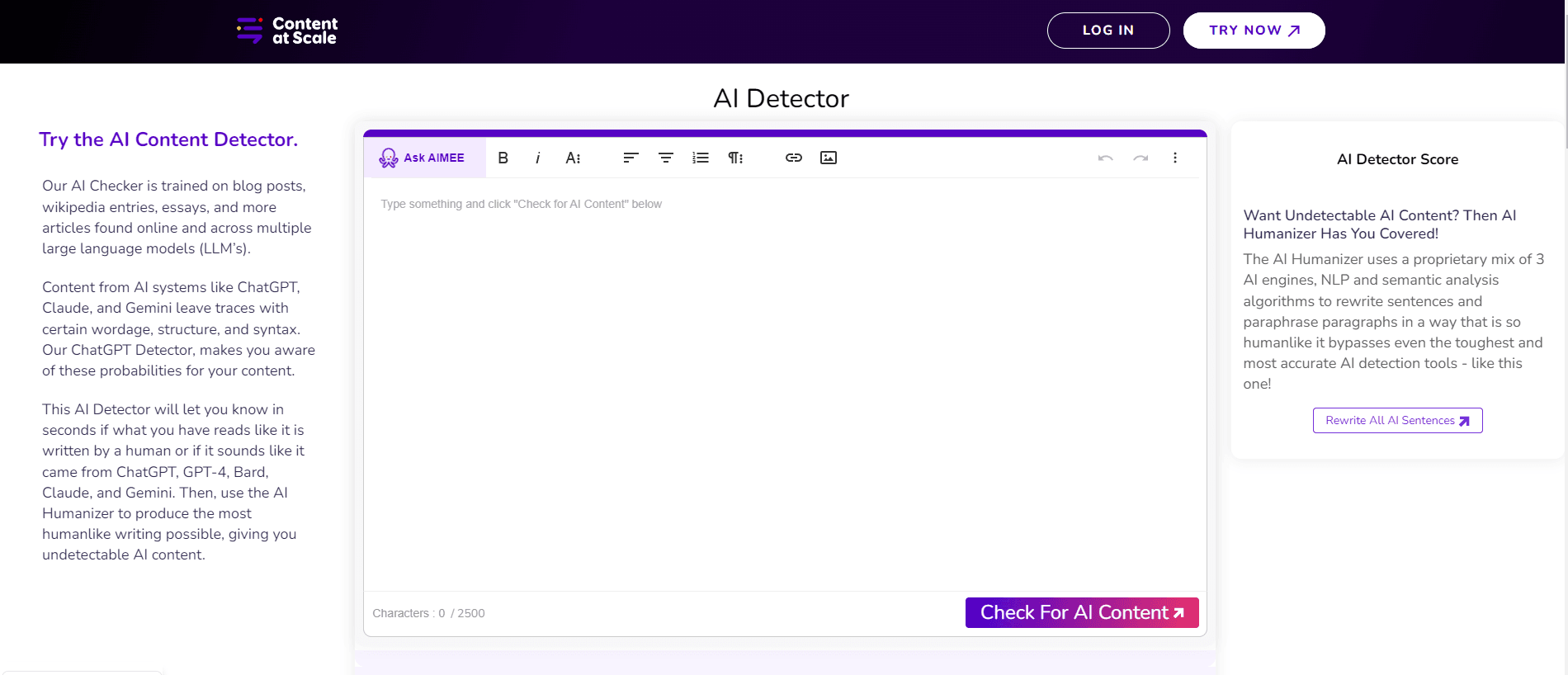 The Content at Scale AI Detector is a free tool designed to identify AI-generated content and human-written content. This tool supports very reliable AI content testing and detection by performing analytical steps and comparing them with previously verified data.