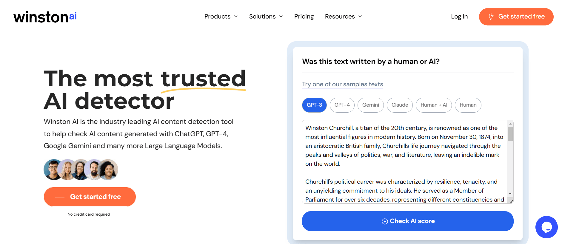 Winston AI is one of the most trusted AI detector tools that help to check AI content generated with ChatGPT, GPT-3, GPT-4, Claude, and many more Large Language Models. All you should do is simply copy and paste your desired content into Winston AI's artificial intelligence content analyzing section and hit their scanning text option.