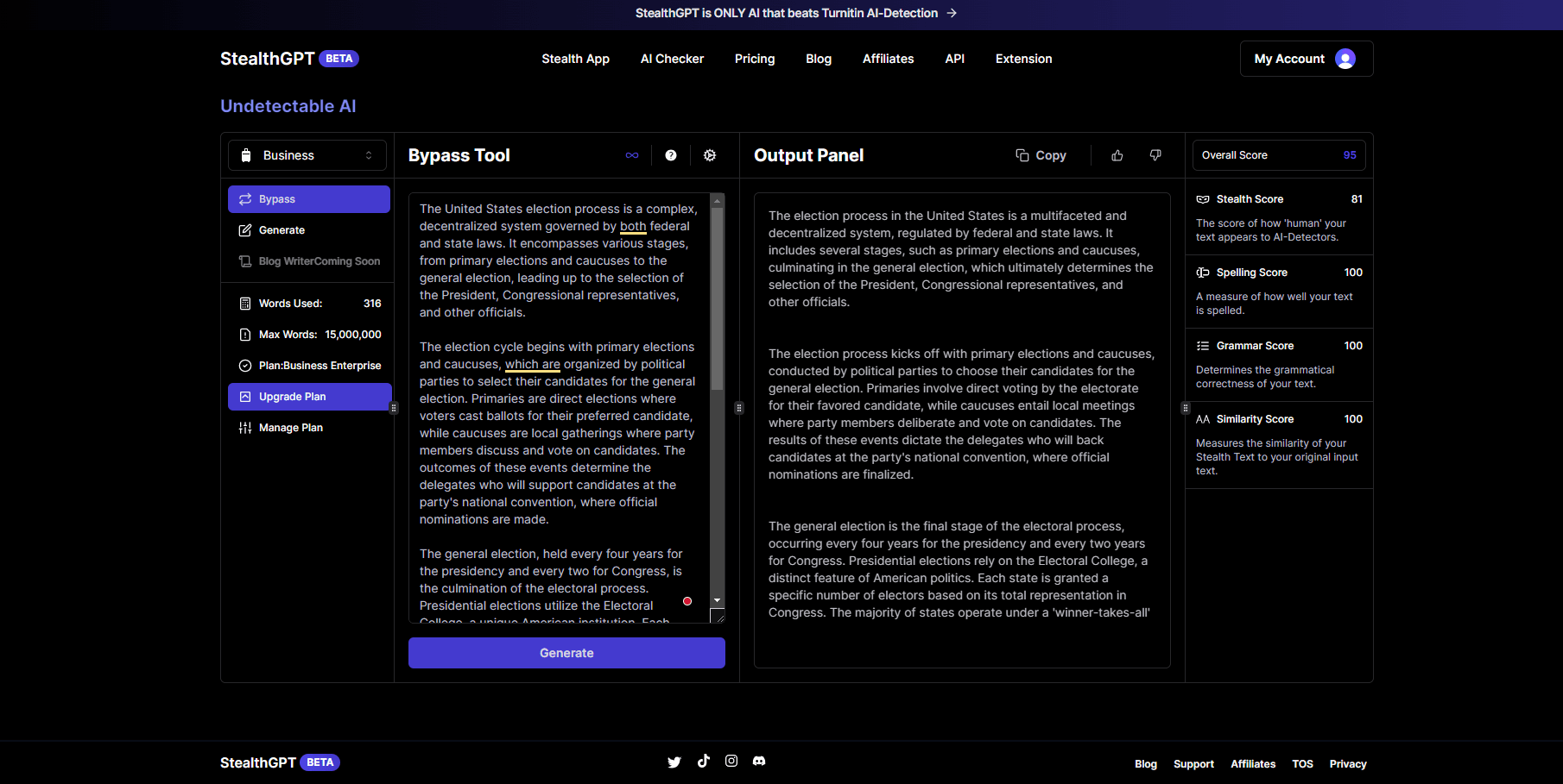 We have taken the same ChatGPT output and put that through StealthGPT’s bypass tool.