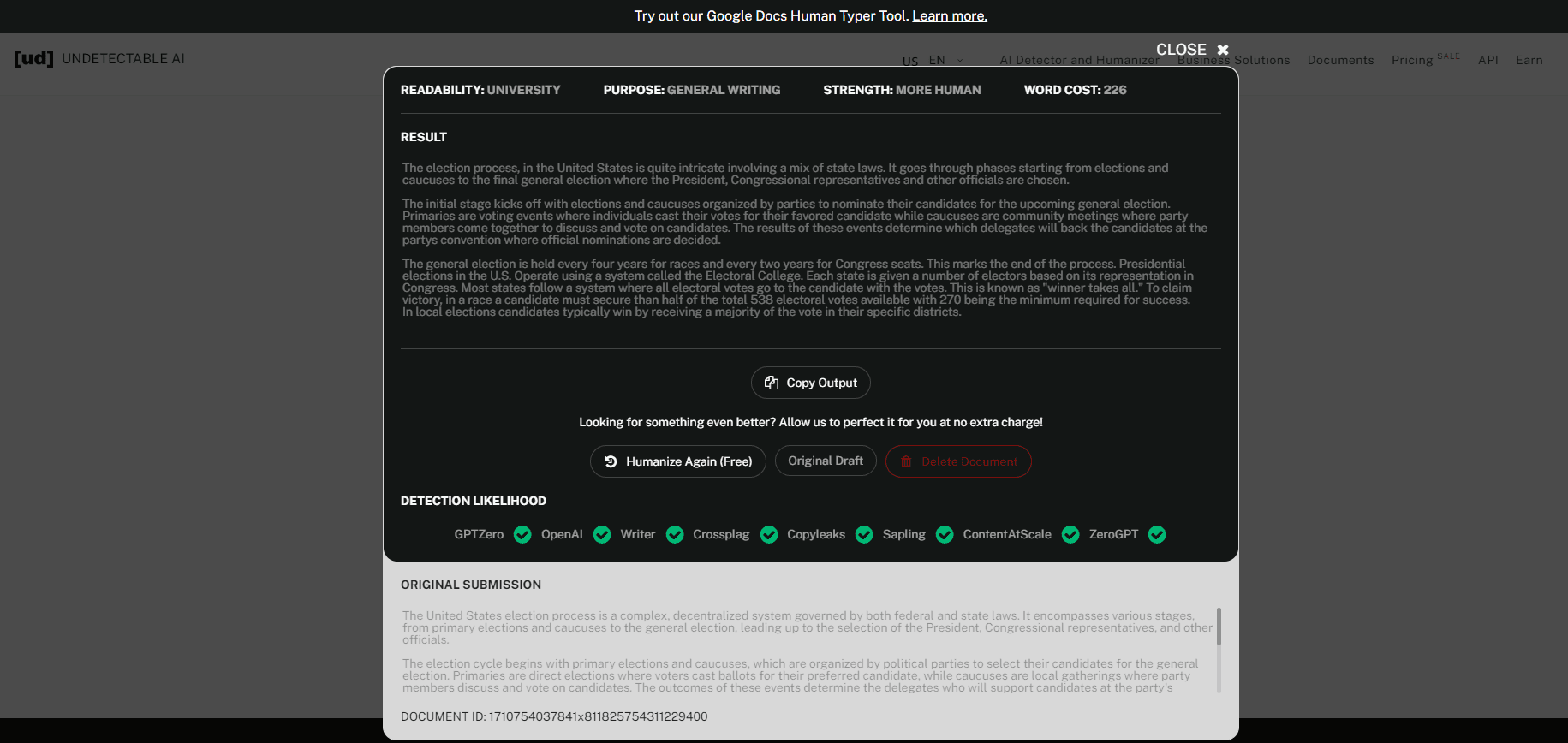 However, a significant aspect of our analysis revolves around the effectiveness of Undetectable AI, particularly in its claims to outperform detection models like GPTZero. GPTZero gained prominence for its ability to distinguish between human and AI-written texts with remarkable accuracy, serving as a benchmark for testing the indistinguishability of AI-generated content. Our examination dives into comparative studies and tests that pit Undetectable AI’s output against GPTZero's detection capabilities. By analyzing the detection rates, error margins, and specific instances where Undetectable AI failed or succeeded in evading GPTZero, we gain insights into the limitations and potential areas for improvement in making AI-generated content truly undetectable.
