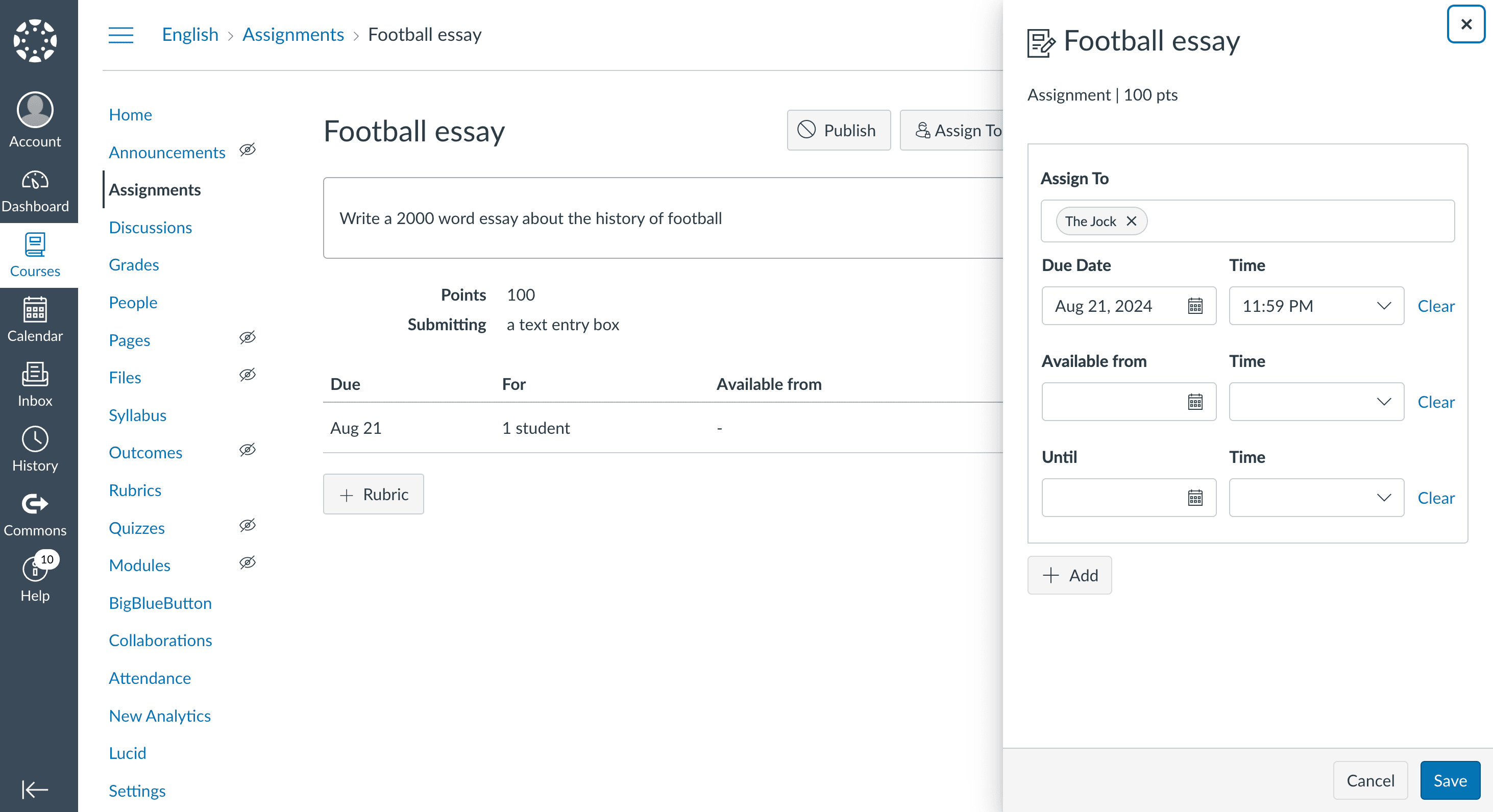For the sake of our sample, we’ve added the jock to our class and created some course content in the form of a Football essay assignment that we’ve assigned The Jock to write. You can look below at the all the customization options for your assignments.