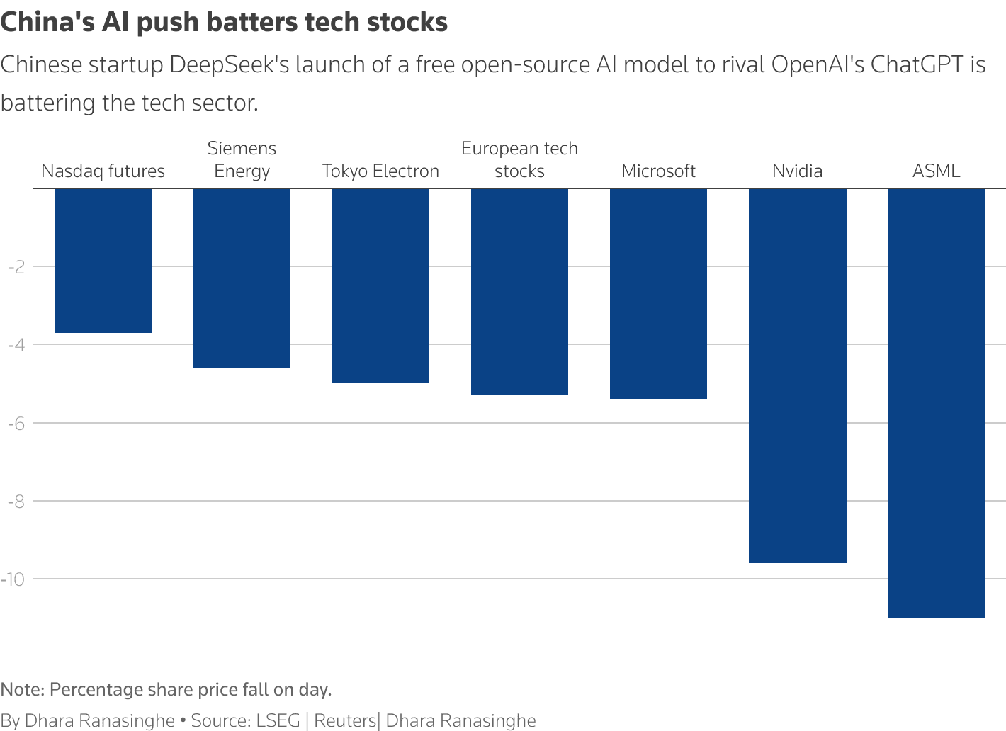 Many US stocks tanked as a result of China’s Deepseek phenomenon, including Nvidia, Nasdaq Futures, Meta, Google, Microsoft, OpenAI and more. Apple, who hasn’t released an AI model, wasn’t as effected by the Deepseek release.