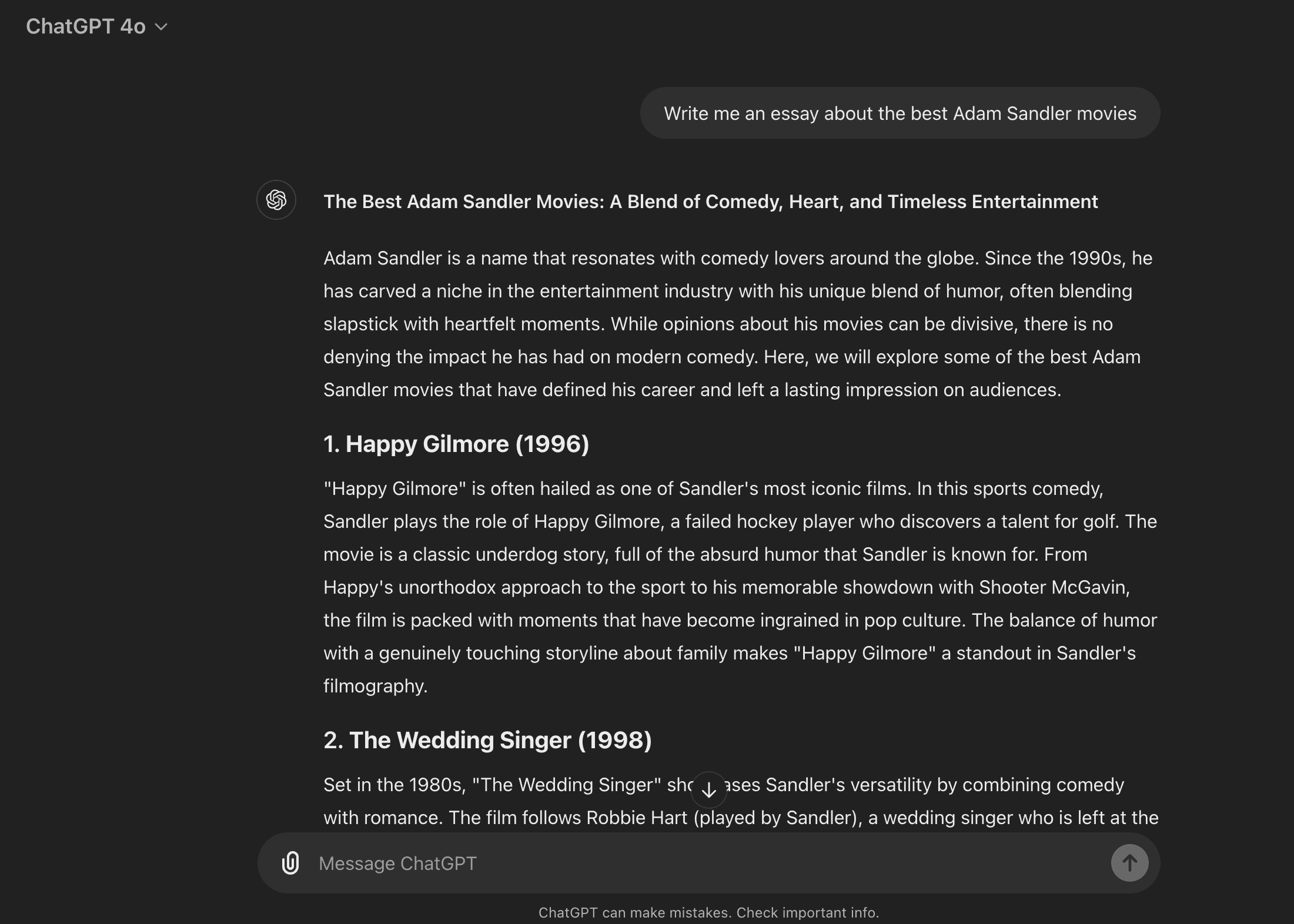 Here’s an essay I just asked ChatGPT to write about Adam Sandler movies: