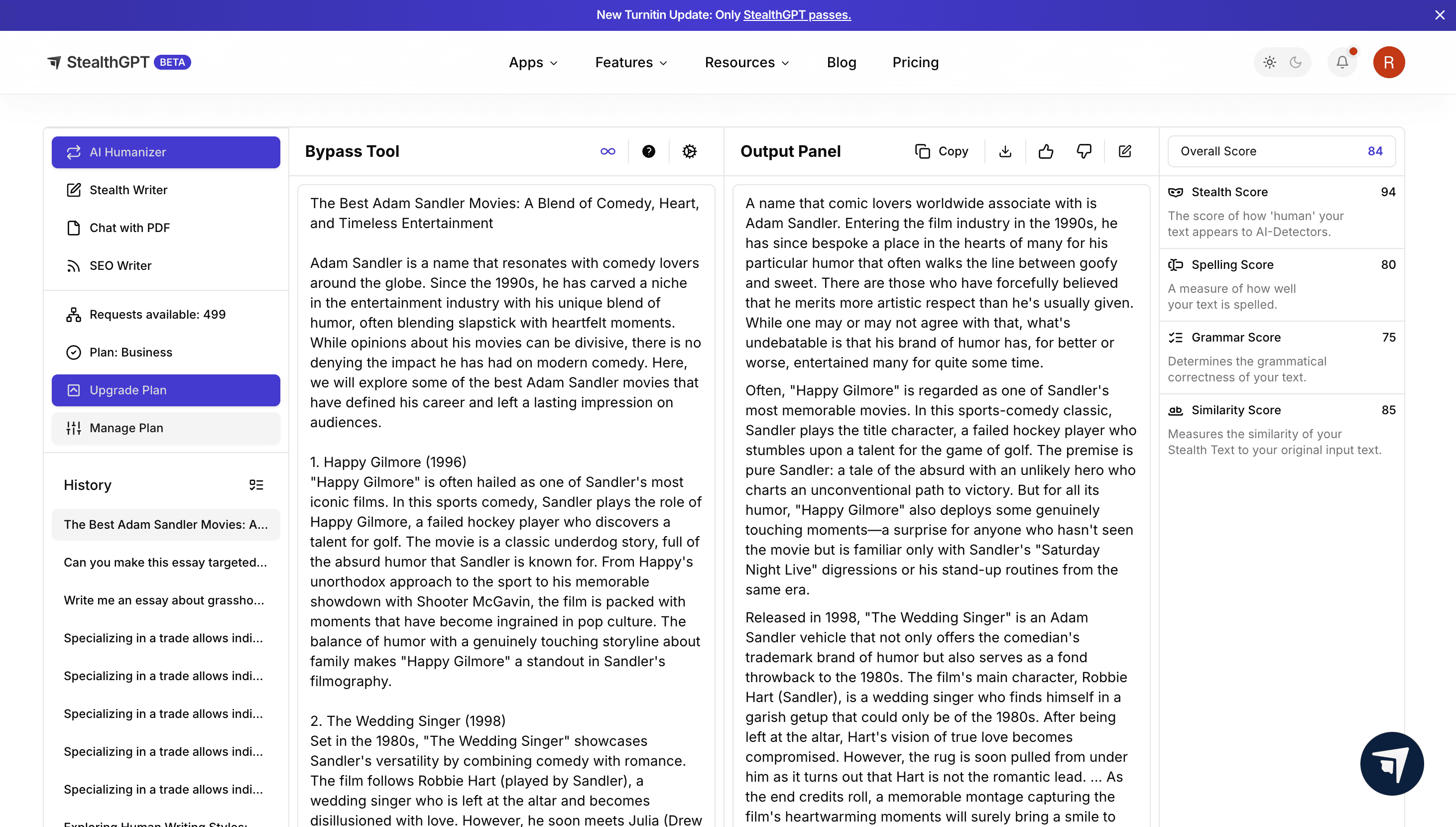 Using StealthGPT’s Stealth AI system, we’re going to humanize our original Adam Sandler essay and see if it fares better against Turnitin than Grammarly.